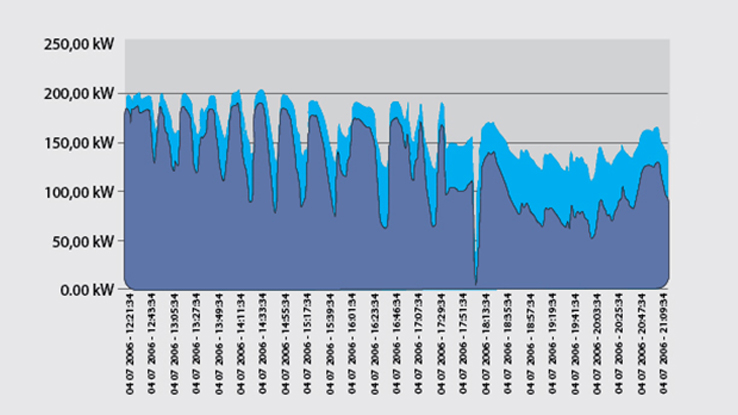 In order to map the load profile, Danfoss chose the current as a reference because it has a direct relationship with the compressor’s load percentage. Normally, an a.c. motor on no-load uses one third of its rated current, and in the case of a screw type compressor, when on no-load, the current usually reaches a value close to 40% of the motor’s rated current.