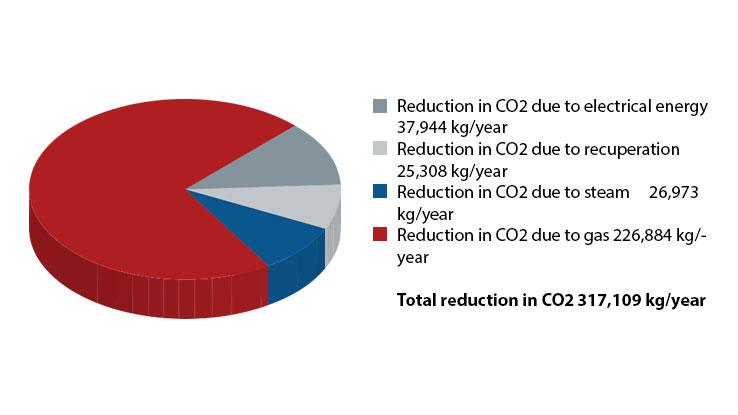 The graph shows reduction of CO2 footprint in total, when using a Gostol cyclotermic tunnel baking oven type TPN to bake bread or other products, by comparison with an older traditional oven.
