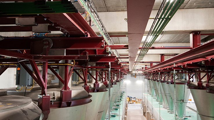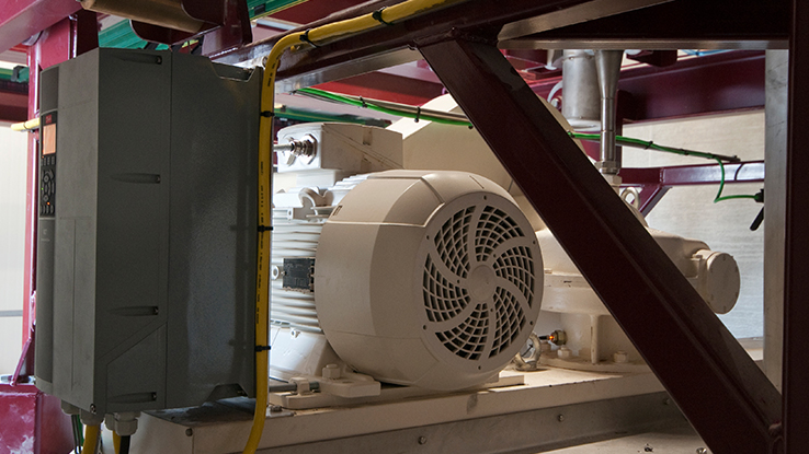 Positioning via Smart Logic ControllerPositioning of each mixer is handled by the VLT® Smart Logic Controller as they are moved around on automatic wagons, also connected to a PLC via wireless PROFINET. The wagons are also powered from the common rail in the ceiling.
