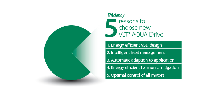 Our tight focus on energy efficiency at every stage of development, including the net efficiency when the new generation VLT® AQUA Drive is installed, means that you get a drive that delivers cost savings of up to 25% of the investment in the drive in its first year, when compared to traditional AC-drive solutions. That’s the equivalent to the savings gained by choosing an IE 3 motor instead of an IE 2.