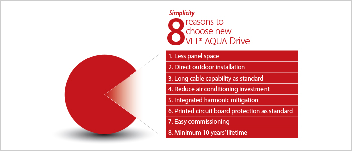 8. Designed for a minimum 10 years’ lifetimeWith the VLT AQUA Drive’s high-quality components, maximum 80% load on components and intelligent heat management reducing dust on PCBs, the need for routine scheduled parts replacements, such as electrolytic capacitors and fans, has been removed.